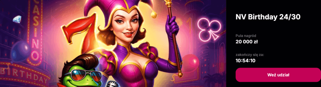 Jeśli nie masz jeszcze konta w NVcasino, to teraz jest idealny moment na to, żeby to zmienić. Bonus powitalny wynosi aż 10 000 zł, a poza tym możesz zgarnąć aż 225 darmowych spinów. Dorzucając do tego urodzinowe promocje, możesz zyskać naprawdę dużo!